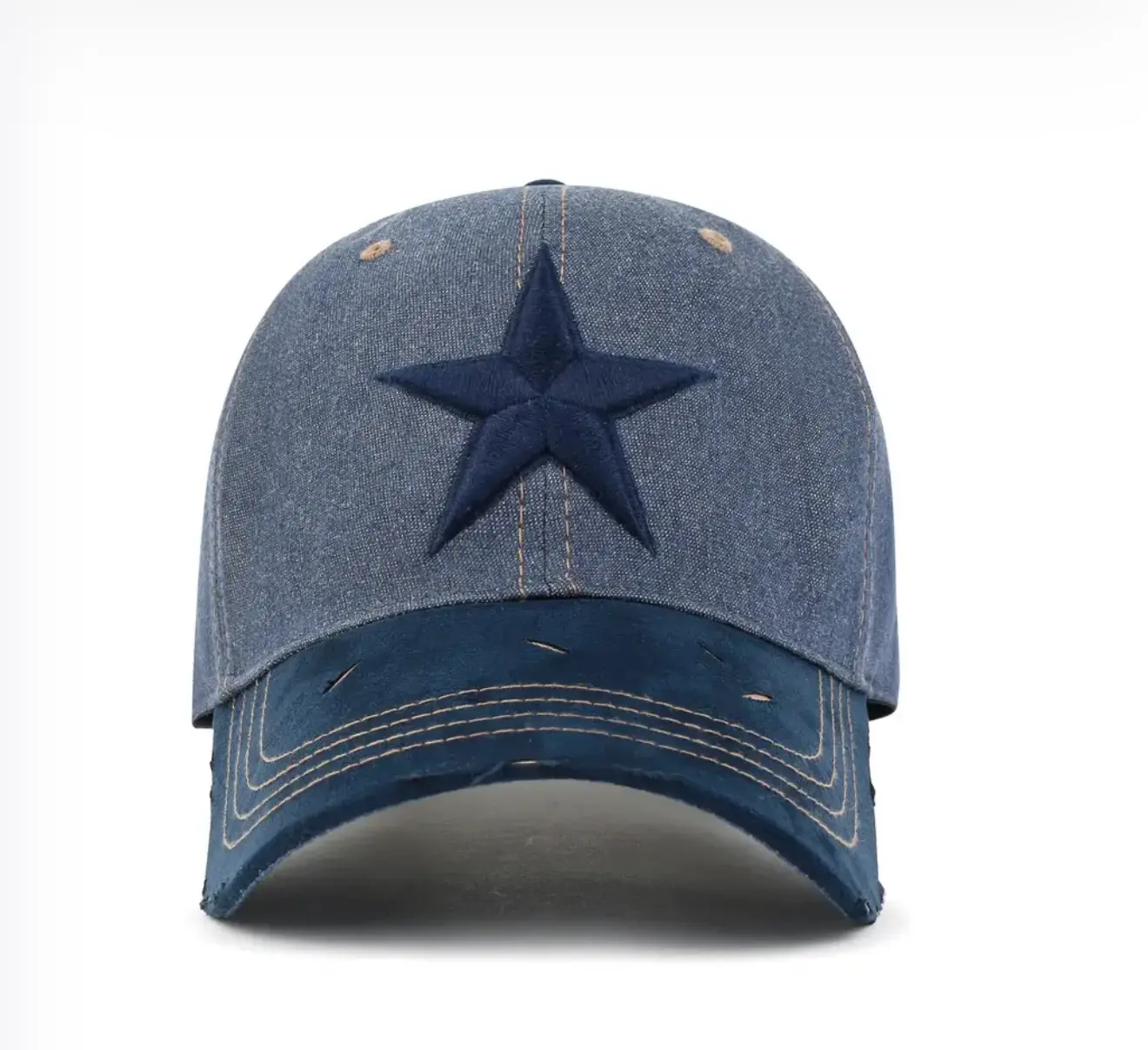 التزيين/التطريز: قبعة بيسبول من الدنيم القطني مع تطريز نجمة وحافة مهترئة  من جلد ، بطانة من القماش القطني للحفاظ على شكل التاج