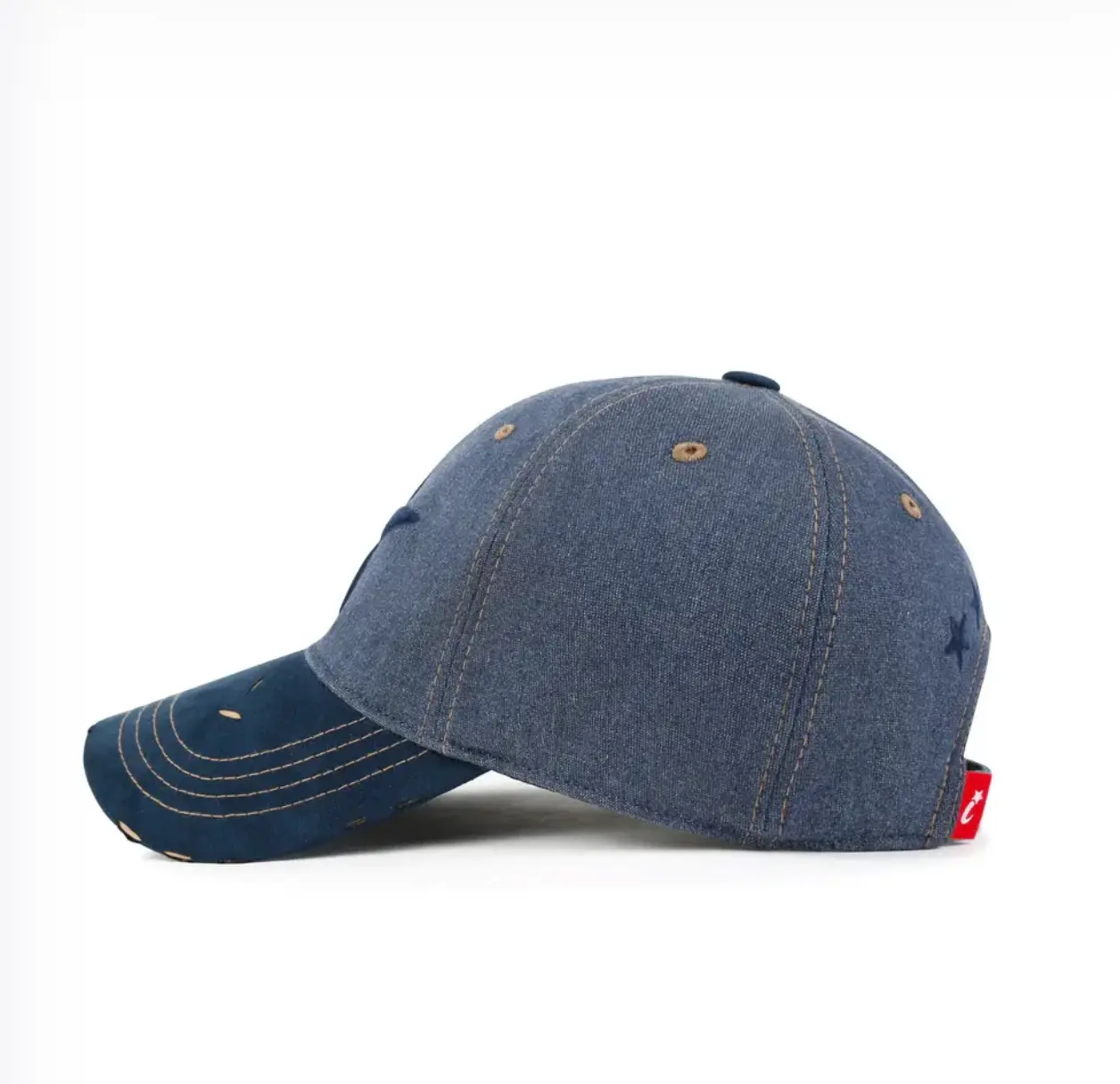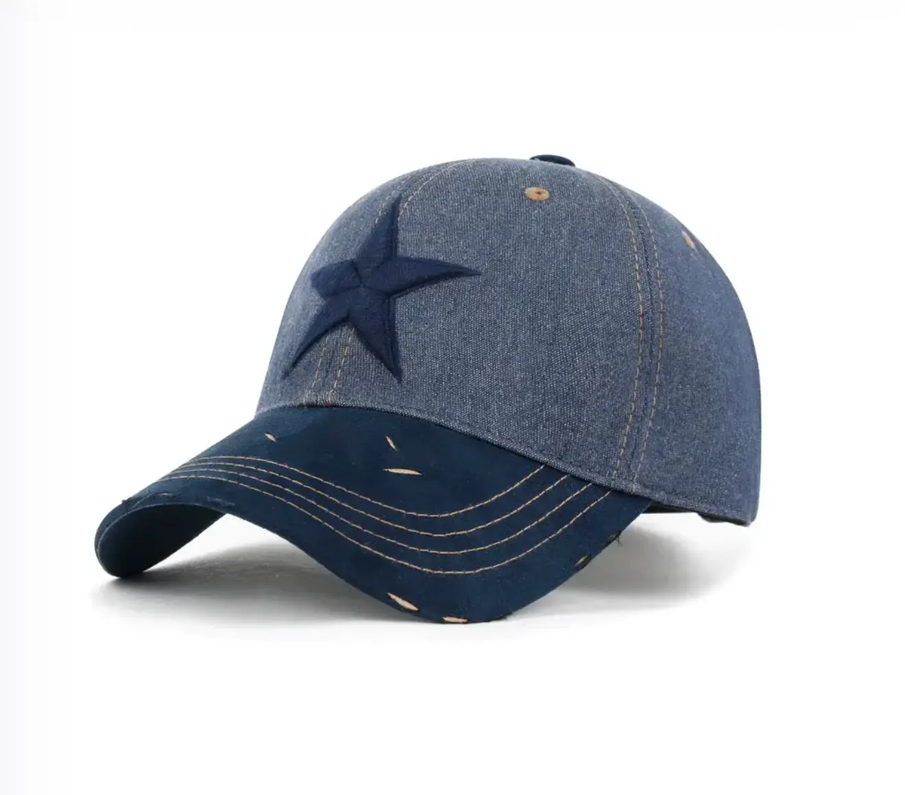 التزيين/التطريز: قبعة بيسبول من الدنيم القطني مع تطريز نجمة وحافة مهترئة من جلد ، بطانة من القماش القطني للحفاظ على شكل التاج