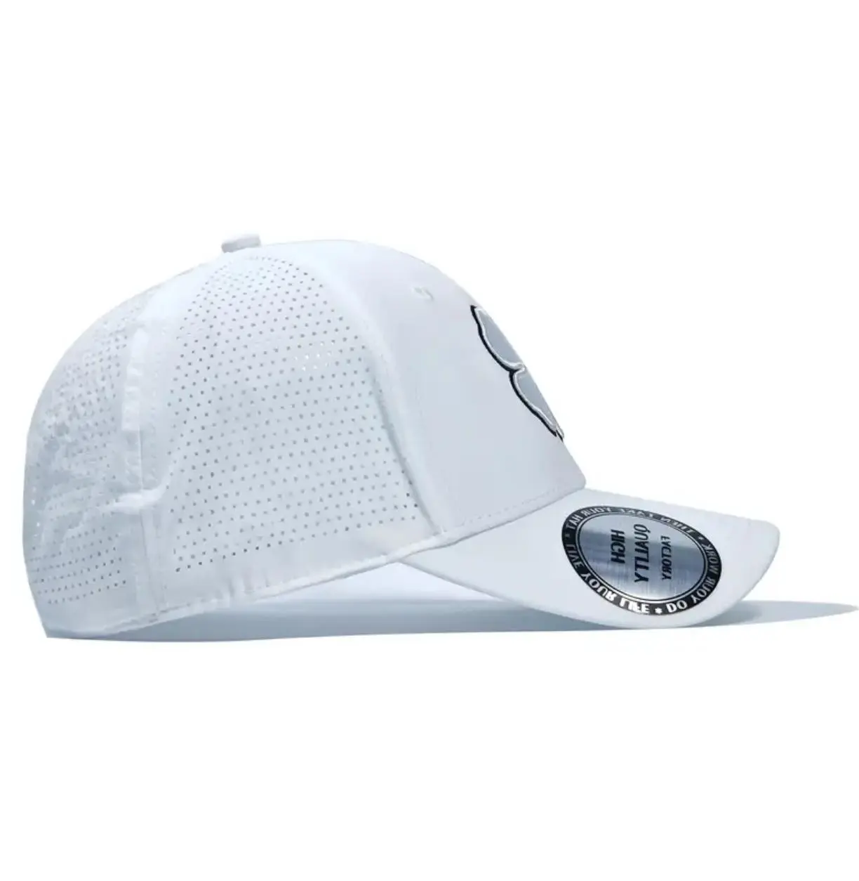 1. القبعة بيضاء اللون بالكامل مع تصميم مثقب/شبكي على الجوانب والخلف للتهوية