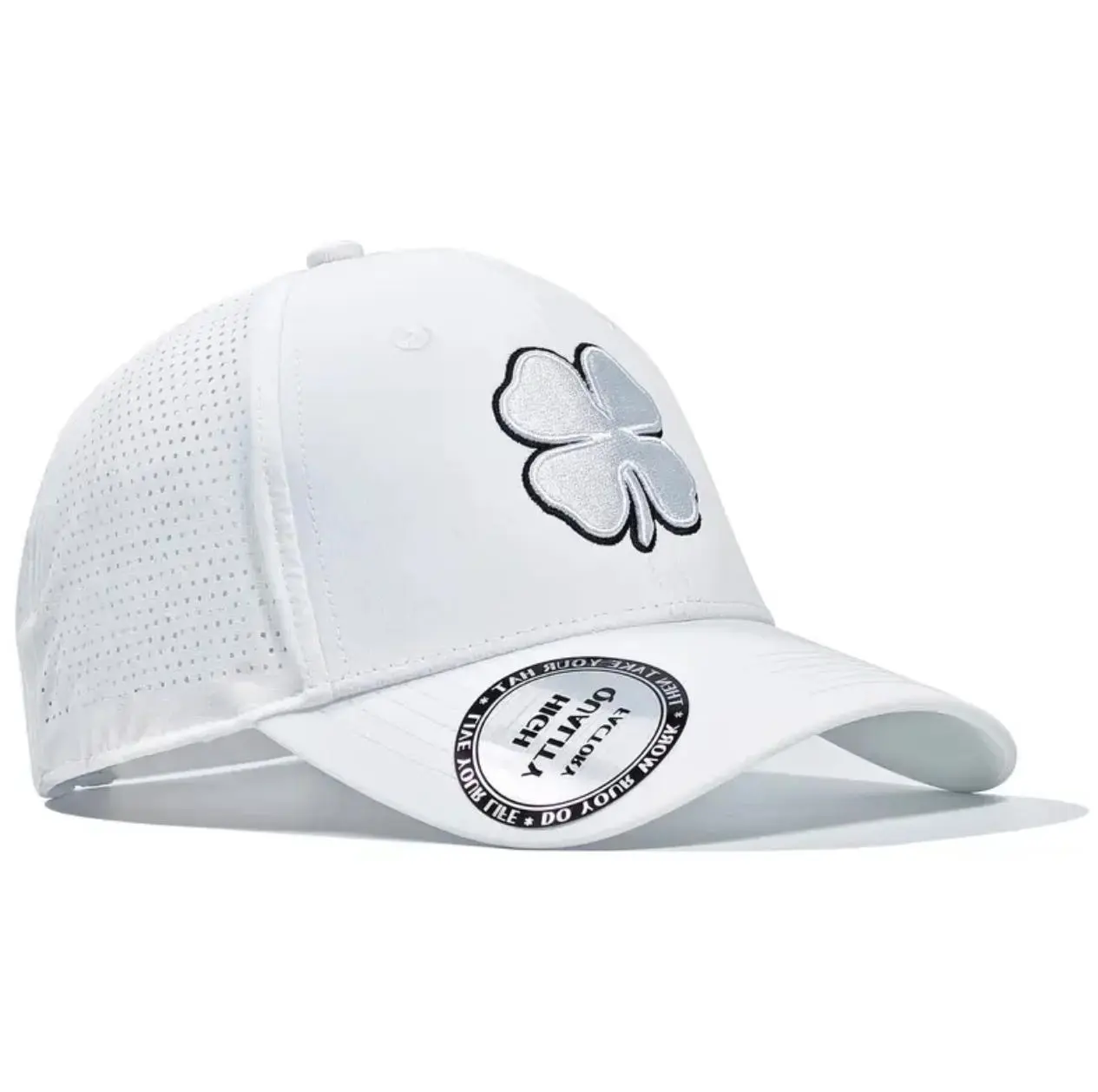قبعة بيسبول بيضاء ذات مميزات متعددة.